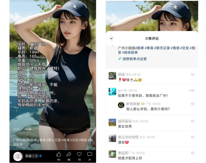 娛資也觀察到,某家婚戀公司的視頻號(hào)在大面積使用AI產(chǎn)出的美女素材和簡(jiǎn)介,吸引人報(bào)名相親,“評(píng)論區(qū)一堆人問怎么要聯(lián)系方式,能看出來是AI產(chǎn)出的沒幾個(gè)人。拉群,準(zhǔn)備一些托,三四線城市的單身就可以圈起來了,全是韭菜,信息差大的可怕?!毙旅襟w專家章良向河豚君介紹道。
