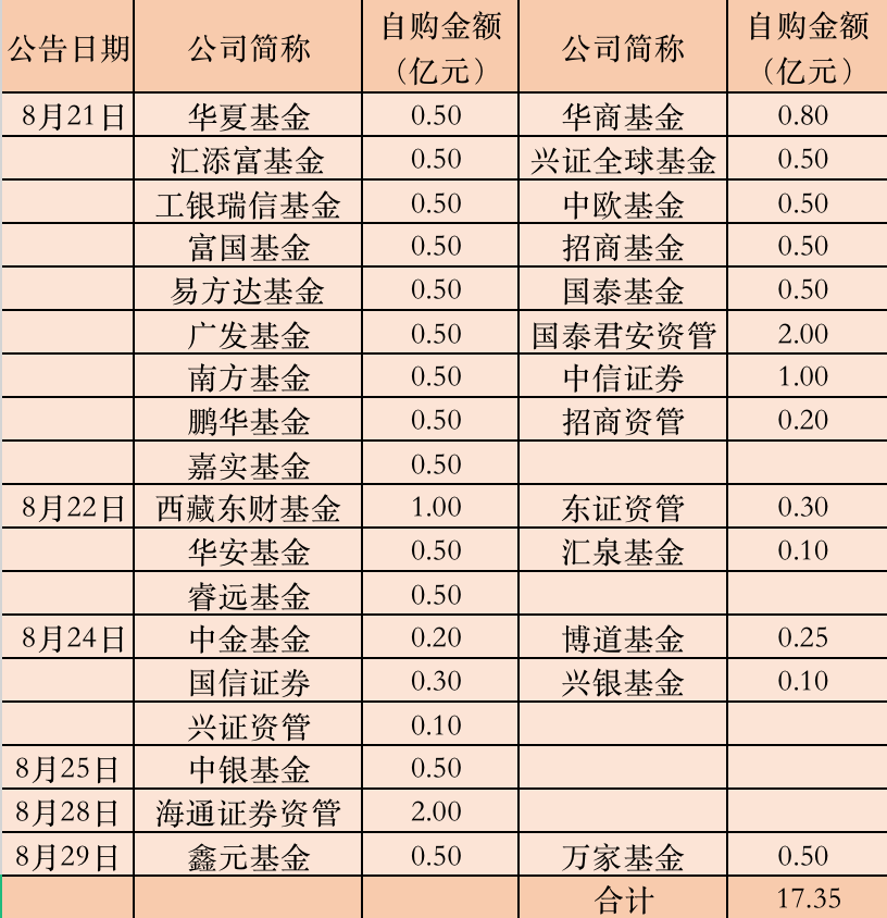 隨后,公募基金自購規(guī)模繼續(xù)擴(kuò)大。8月22日、24日、25日、28日及29日,西藏東財基金、國信證券、興證資管、中銀基金、鑫元基金等機(jī)構(gòu)加入自購隊伍。