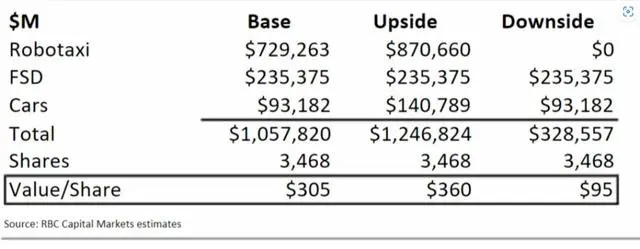 7月19日,加拿大皇家銀行資本市場(chǎng)分析師Tom Narayan為特斯拉的業(yè)務(wù)進(jìn)行估值,他在報(bào)告中認(rèn)為,特斯拉汽車(chē)業(yè)務(wù)的估值約為931.82億美元;FSD業(yè)務(wù)的估值約為2353.75億美元;robotaxi業(yè)務(wù)的估值約為7292.63億美元,要遠(yuǎn)遠(yuǎn)超過(guò)FSD和汽車(chē)業(yè)務(wù)。