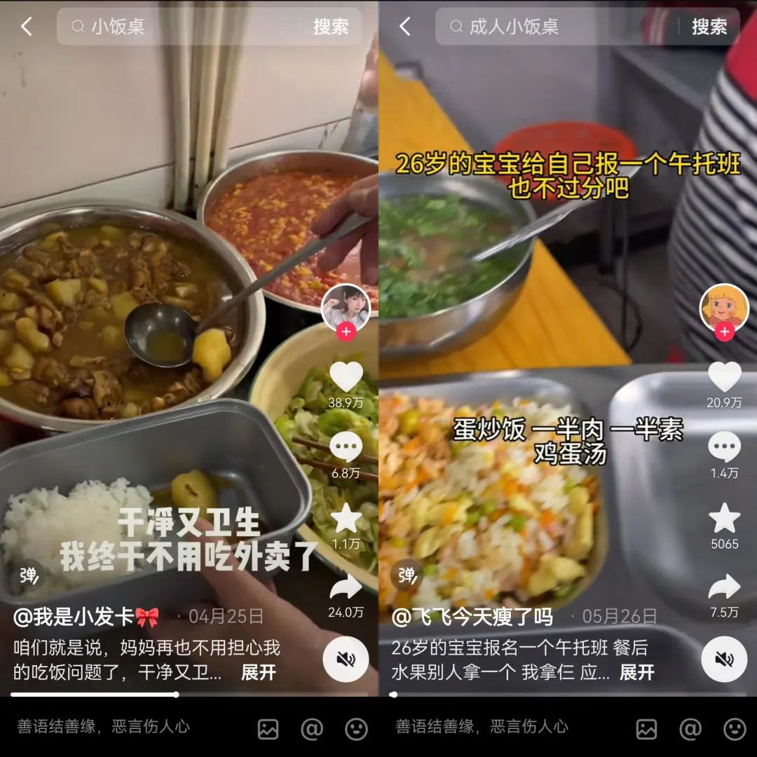 打工人主動(dòng)和中小學(xué)生成為了“飯搭子”,吃著十幾塊錢一頓的午飯,“健康又衛(wèi)生”。社交平臺(tái)讓相關(guān)話題迅速躥紅:小紅書(shū)上,和“小飯桌”有關(guān)的筆記已經(jīng)達(dá)到了3萬(wàn)多篇;抖音上,#小飯桌#的話題播放量達(dá)到了2.1億次。