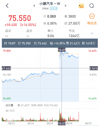 正因如此,該公告發(fā)布后,小鵬汽車股價應(yīng)聲而漲,當(dāng)日港股開盤,小鵬汽車股價大漲16.05%至75.550港元/股。美股當(dāng)日股價同樣也有上漲,漲幅達到5.31%,收盤為18.46美元/股。