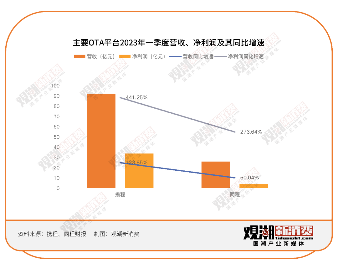 首先是“訂”,即OTA平臺。從攜程、同程兩家主流平臺來看,2023年一季度營收及凈利潤均有大幅增長,其中凈利潤的增長最為可觀。去年兩家凈利潤均為負值,今年不僅扭虧為盈,更是獲得了翻倍的增長。