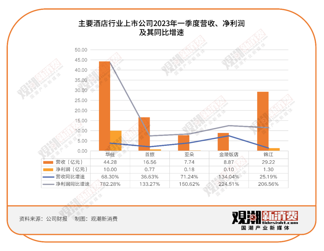 其次是“住”。酒店行業(yè)主要上市公司第一季度財報顯示,主要公司凈利潤均實現(xiàn)成倍數(shù)增長,并且同比去年均實現(xiàn)扭虧為盈,其中華住的凈利潤從去年同期的-6.49億元爆發(fā)式增長至今年一季度的10億元。