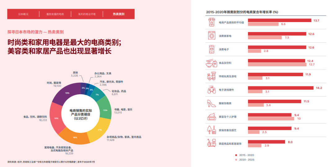根據(jù)Facebook與Kantar在2021年發(fā)布的《制勝日本電商市場(chǎng)白皮書(shū)》,從2015年到2020年,日本市場(chǎng)美妝和個(gè)護(hù)電商復(fù)合年增長(zhǎng)率達(dá)9.4%,位列倒數(shù)第三位,而從2020-2025年,美妝和個(gè)護(hù)電商復(fù)合年增長(zhǎng)率預(yù)計(jì)將達(dá)到10%,從倒數(shù)第三躍升到第二,也可預(yù)見(jiàn)美妝品類(lèi)在日本電商市場(chǎng)具有機(jī)會(huì)。