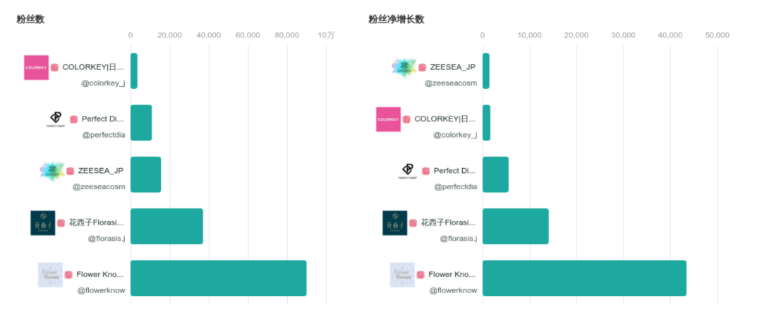 在Instagram平臺(tái),花知曉、花西子、滋色是日本市場(chǎng)粉絲數(shù)TOP3的國(guó)產(chǎn)美妝品牌,完美日記、colorkey則在近一年內(nèi)顯現(xiàn)出不錯(cuò)的粉絲增長(zhǎng)趨勢(shì)。
