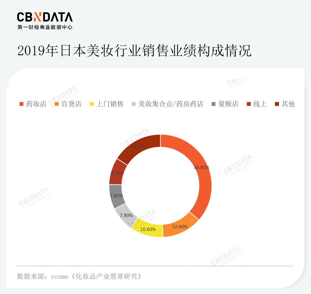 從2019 年各渠道銷(xiāo)售業(yè)績(jī)來(lái)看,藥妝店是美妝銷(xiāo)售最高的渠道,其次是百貨店(12.6%)、上門(mén)銷(xiāo)售(類(lèi)似國(guó)內(nèi)地推形式)(10.6%)、線(xiàn)上銷(xiāo)售(包含品牌獨(dú)立站和第三方電商平臺(tái))(8.5%)、美妝集合店/藥房藥店(7.9%)、量販店(7.8%),線(xiàn)下仍然是日本美妝消費(fèi)的主流渠道。