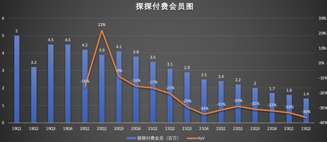 今年二季度,探探的月活用戶為1730萬,相比去年同期的2480萬,凈流失750萬,與一季度的1950萬相比,凈流失220萬。探探的付費會員為140萬,與去年同期的220萬相比,凈流失80萬,與一季度的160萬相比,凈流失20萬。