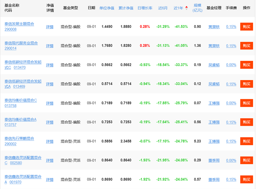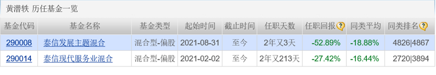 經(jīng)查詢,基金經(jīng)理黃潛軼2021年2月起開始負(fù)責(zé)泰信現(xiàn)代服務(wù)業(yè)混合基金,同年8月又擔(dān)任泰信發(fā)展主題混合基金經(jīng)理。截至目前,兩只產(chǎn)品的任職回報分別為-52.89%,-27.42%,近一年內(nèi)跌幅超40%。