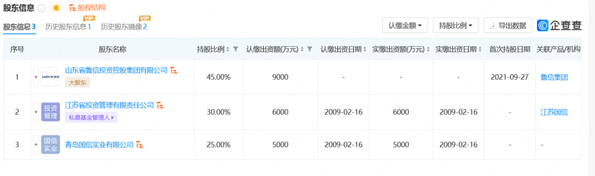 企查查顯示,泰信基金是監(jiān)管獲準(zhǔn)籌建的第一家以信托公司為主發(fā)起人的公募基金。2021年9月初,山東省國際信托股份有限公司(下稱“山東信托”)將其持有的45%股權(quán)轉(zhuǎn)讓給了目前的大股東魯信集團(tuán)后,公司的股權(quán)構(gòu)一直由魯信集團(tuán)持股45%,江蘇省投資管理有限責(zé)任公司、青島國信實(shí)業(yè)有限公司(下稱“青島國信”)分別持股30%、25%,這樣的股權(quán)結(jié)構(gòu)一直維持至今。