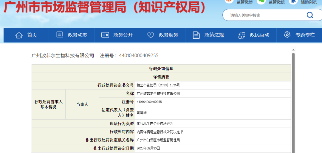 日前(8月30日),聚美麗從廣州市場(chǎng)監(jiān)督管理局(以下簡(jiǎn)稱:廣州市監(jiān)局)獲悉,廣州波菲爾生物科技有限公司(以下簡(jiǎn)稱:波菲爾)因化妝品生產(chǎn)違法行為,被處罰531.8萬。