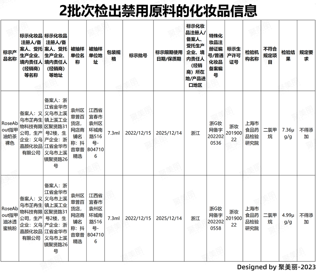 國(guó)家藥品監(jiān)督管理局發(fā)布的《國(guó)家藥監(jiān)局關(guān)于2批次化妝品檢出禁用原料的通告(2023年第42號(hào))》中顯示,備案人為義烏市芷冉生物科技有限公司,生產(chǎn)企業(yè)為義烏嘉顏化妝品有限公司生產(chǎn)的RoseAbout指甲油奶茶裸色、RoseAbout指甲油冰透蜜桃粉兩個(gè)產(chǎn)品,由上海市食品藥品檢驗(yàn)研究院檢測(cè)出均含有二氯甲烷,含量分別為7.36μg/g、4.99μg/g。