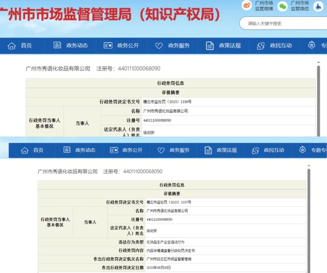 與此同時(shí),聚美麗從廣州市監(jiān)局公布處罰信息中發(fā)現(xiàn),兩則產(chǎn)品處罰信息均來自同一家企業(yè)。