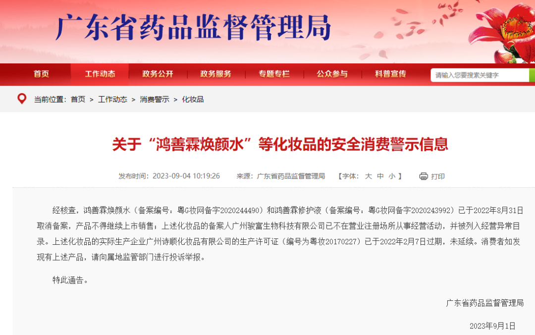 近日,廣東省藥品監(jiān)督管理局發(fā)布了一條涉及“鴻善霖?zé)佀钡然瘖y品的安全消費(fèi)警示信息(下稱“消費(fèi)警示”)。該消息指出,鴻善霖?zé)佀?、鴻善霖修護(hù)液兩款產(chǎn)品已于2022年8月31日取消備案,不得繼續(xù)上市銷售。