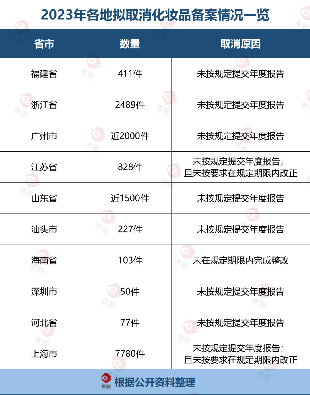 分地區(qū)來(lái)看,上海、浙江、廣州在今年擬取消化妝品備案產(chǎn)品數(shù)量方面位列前三,分別擬取消了7780件、2489件(國(guó)產(chǎn)普通化妝品及進(jìn)口普通化妝品數(shù)量分別為2162件、327件)、近2000件產(chǎn)品的備案。而擬取消原因一般包括兩種情況,一是未提交備案時(shí)間滿一年普通化妝品的年度報(bào)告;二是未按要求在規(guī)定期限內(nèi)改正已知的問(wèn)題。