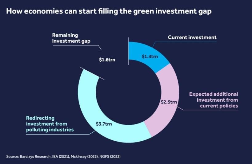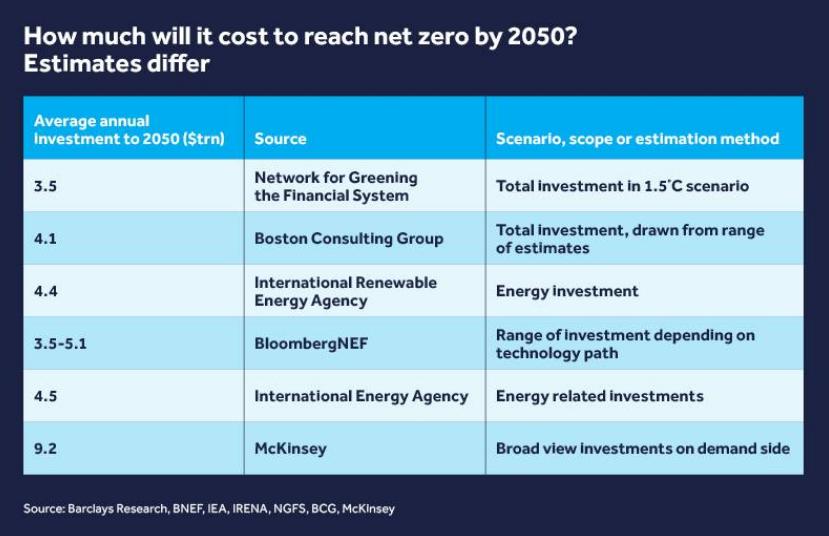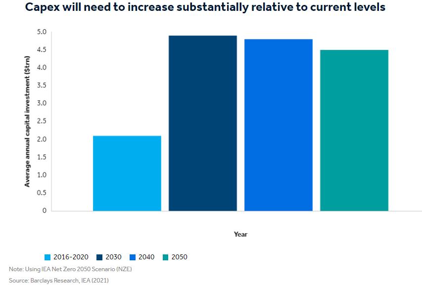 到2050年,想要實(shí)現(xiàn)凈零排放目標(biāo)的綠色轉(zhuǎn)型,則需要對(duì)世界能源、運(yùn)輸和工業(yè)系統(tǒng)進(jìn)行全面改革,并轉(zhuǎn)變農(nóng)業(yè)和林業(yè)行為。這將需要大量的投資——遠(yuǎn)遠(yuǎn)超過(guò)目前世界所能提供的。巴克萊分析師列出了該領(lǐng)域投資需求的三個(gè)關(guān)鍵方面。