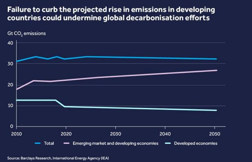 由于能源占全球排放量的近75%,而發(fā)展中經(jīng)濟(jì)體在未來(lái)幾乎占了所有額外的能源需求,因此需要大量投資,以避免發(fā)達(dá)經(jīng)濟(jì)體的脫碳努力無(wú)法抵消全球排放量增加的情況。