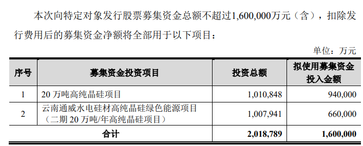 在劉舒琪上臺(tái)不久,通威股份便拋出了160億元定增計(jì)劃,其中94億元用于20萬(wàn)噸高純晶硅建設(shè),66億元用于云南通威水電硅材高純晶硅(二期項(xiàng)目)建設(shè)。