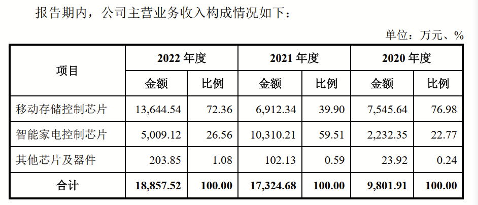 在營收中,移動存儲控制芯片是其主要營收來源,2020年-2022年收入占比分別為76.98%、39.9%和72.36%。