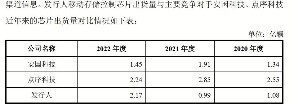 值得一提的是,《招股書》顯示,芯邦科技在移動存儲控制芯片領(lǐng)域的競爭對手以中國臺灣地區(qū)的公司為主,其中較為知名的公司包括安國科技、點序科技。以2022年為例,安國科技、點序科技的營收分別約為3.7億元和4.4億元。