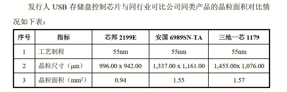 在USB存儲盤控制芯片領(lǐng)域,同為55nm工藝制程下,芯邦科技2199E產(chǎn)品的晶粒面積僅為0.94平方毫米,而安國科技6989SN-TA、三地一芯1179可比產(chǎn)品的晶粒面積分別為1.55平方毫米、1.57平方毫米,大于芯邦科技2199E晶粒面積。