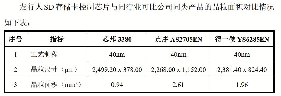 在SD存儲卡控制芯片領(lǐng)域,同為40nm工藝制程下,芯邦科技3380的晶粒面積僅為0.94平方毫米,而點序科技AS2705EN、得一微YS6285EN的晶粒面積分別為2.61平方毫米、1.96平方毫米。