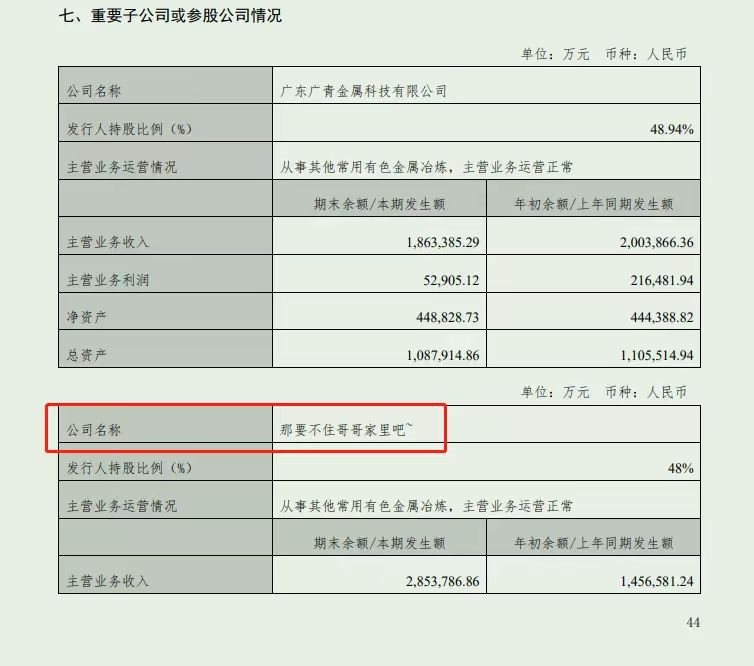 9月12日晚間,廣新控股在深交所更新半年度報(bào)告,并提示“以此為準(zhǔn)”。對(duì)比前后兩份文件,在該半年報(bào)的第44頁,此前寫為“那要不住哥哥家里吧~”的子公司名稱目前已更正為“印尼廣青鎳業(yè)有限公司”(下稱“印尼廣青”)。