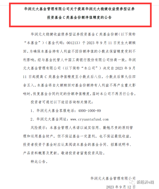 9月12日,華潤元大基金發(fā)布公告稱,華潤元大穩(wěn)健C類基金份額于2023年9月11日發(fā)生大額贖回。為確保本基金持有人利益不因份額凈值的小數(shù)點(diǎn)保留精度受到不利影響,經(jīng)與基金托管人工行協(xié)商一致,公司決定自2023年9月11日起提高C類基金凈值精度至小數(shù)點(diǎn)后八位,小數(shù)點(diǎn)后第九位四舍五入。該基金也為純債基金。