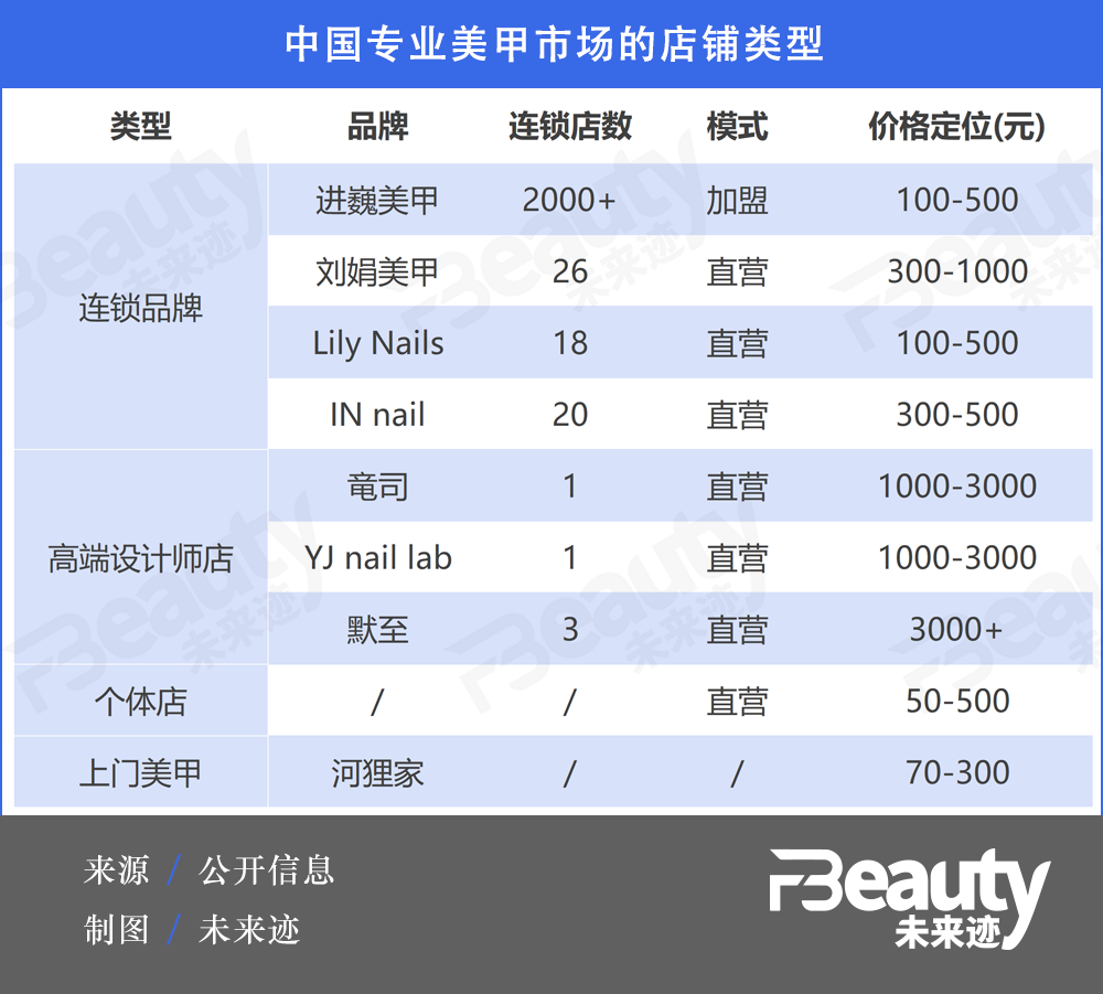 另外業(yè)態(tài)種類多,也是行業(yè)發(fā)展成熟度的一大標(biāo)志。據(jù)《FBeauty未來跡》了解,目前國內(nèi)專業(yè)美甲市場(chǎng)已經(jīng)發(fā)展成個(gè)體店、規(guī)模品牌、個(gè)性化機(jī)構(gòu)和上門到家服務(wù)、自助服務(wù)等多模式并行的綜合業(yè)態(tài)。其中已經(jīng)形成連鎖店規(guī)模的專業(yè)美甲品牌包括進(jìn)巍美甲、劉娟美甲、Lily Nails和IN nail等,其門店大多設(shè)在一二線城市購物中心。