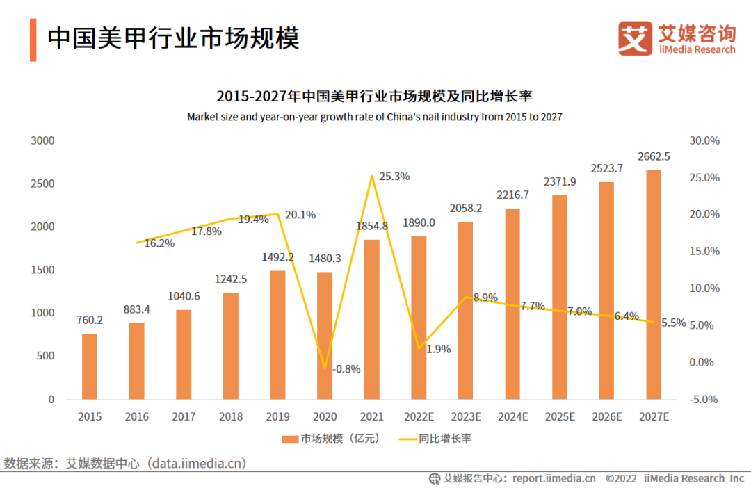 艾媒咨詢發(fā)布的《2022—2023年中國美甲行業(yè)發(fā)展現(xiàn)狀及市場(chǎng)調(diào)研分析報(bào)告》顯示,2015—2027年中國美甲行業(yè)市場(chǎng)規(guī)模呈現(xiàn)逐年上升的趨勢(shì),2021年市場(chǎng)規(guī)模為1854.8億元,同比增長25.3%。預(yù)計(jì)2023年市場(chǎng)規(guī)模超過2000億元。