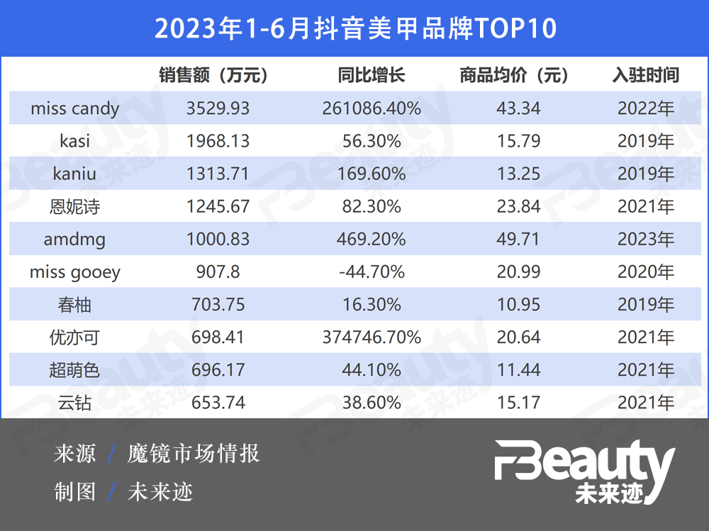 以上半年美甲類產(chǎn)品增速飛快的抖音渠道為例。魔鏡數(shù)據(jù)顯示,2023年1-6月,抖音美甲類產(chǎn)品銷售額為7.6億元,同比增長154.9%。相關(guān)店鋪數(shù)為7258家,而2022全年這一數(shù)字為4947。無論是銷售額還是店鋪數(shù)量,都增勢(shì)猛烈。
