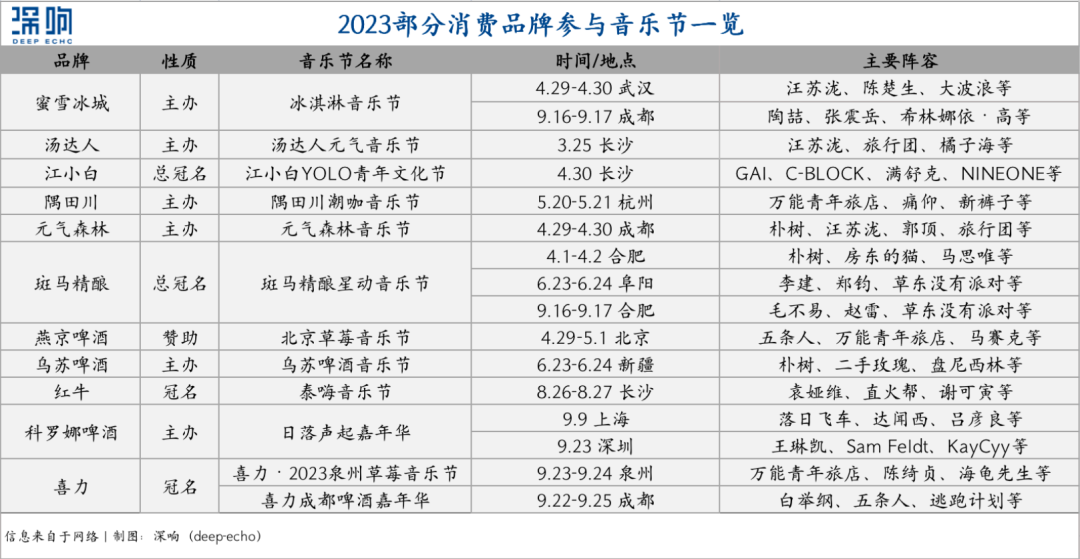 但其實(shí)包括蜜雪冰城在內(nèi)的不少消費(fèi)品牌早已在音樂節(jié)尚未走入大眾視野之前就已入局。