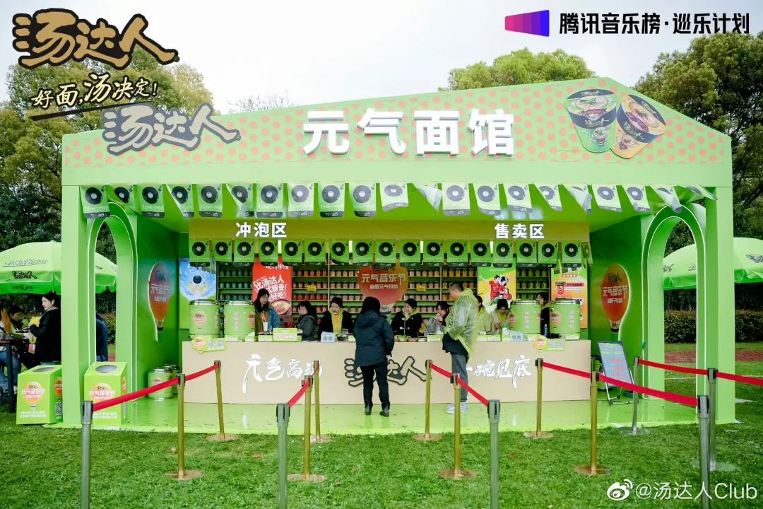比如在湯達(dá)人的元?dú)庖魳饭?jié)上,湯達(dá)人就設(shè)置了包括元?dú)庵斡?、元?dú)鈺r刻、元?dú)庋b扮、元?dú)獠柯?、元?dú)饷骛^、元?dú)馐程昧鶄€場景互動體驗(yàn)場地,在元?dú)饷骛^甚至可以現(xiàn)場購買湯達(dá)人系列產(chǎn)品在現(xiàn)場開水沖泡食用,對于三月份的戶外演出,一碗熱騰騰的泡面無疑具備著相當(dāng)?shù)恼T惑力。
