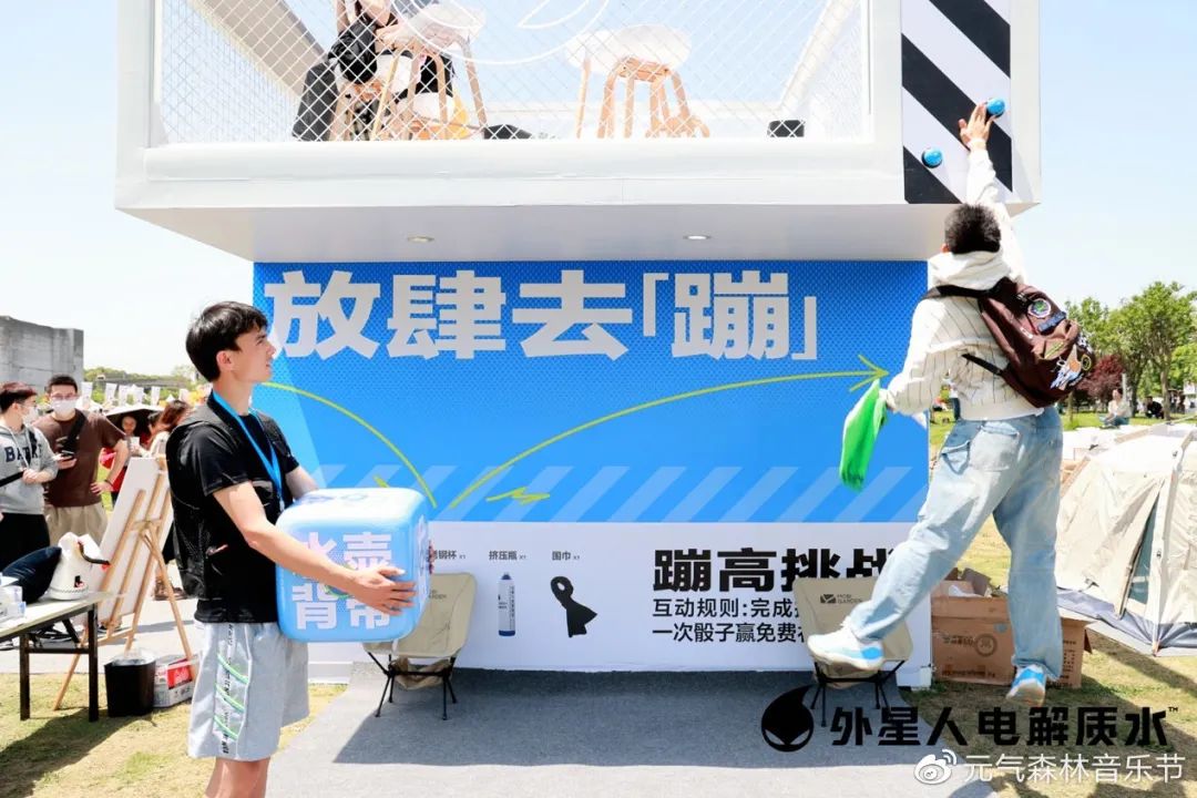 比如元?dú)馍忠魳饭?jié)上,元?dú)馍志驮凇竿庑侨穗娊赓|(zhì)補(bǔ)充艙」設(shè)置了互動游戲蹦高挑戰(zhàn),跳起后摸到墻面上的藍(lán)色按鈕就可以獲得不同的周邊,吸引了不少現(xiàn)場觀眾參與。