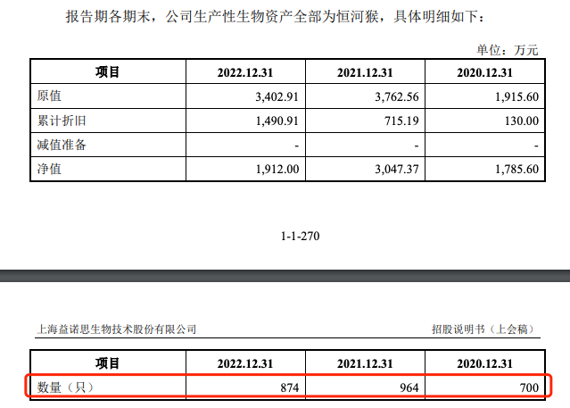 截至2022年底,益諾思賬面上共有874只恒河猴。