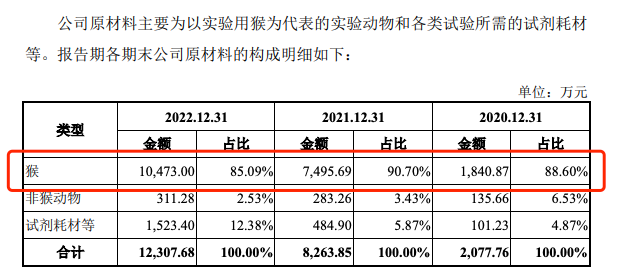 頗具看點(diǎn)的是,實(shí)驗(yàn)用猴是益諾思開展業(yè)務(wù)的主要原材料。2020年-2022年,公司涉及使用實(shí)驗(yàn)用猴的業(yè)務(wù)產(chǎn)生的收入分別為1.17億元、2.6億元和 4.1億元,占主營業(yè)務(wù)收入的比例分別為 35.12%、44.77%和 48.00%,呈逐年提高態(tài)勢。