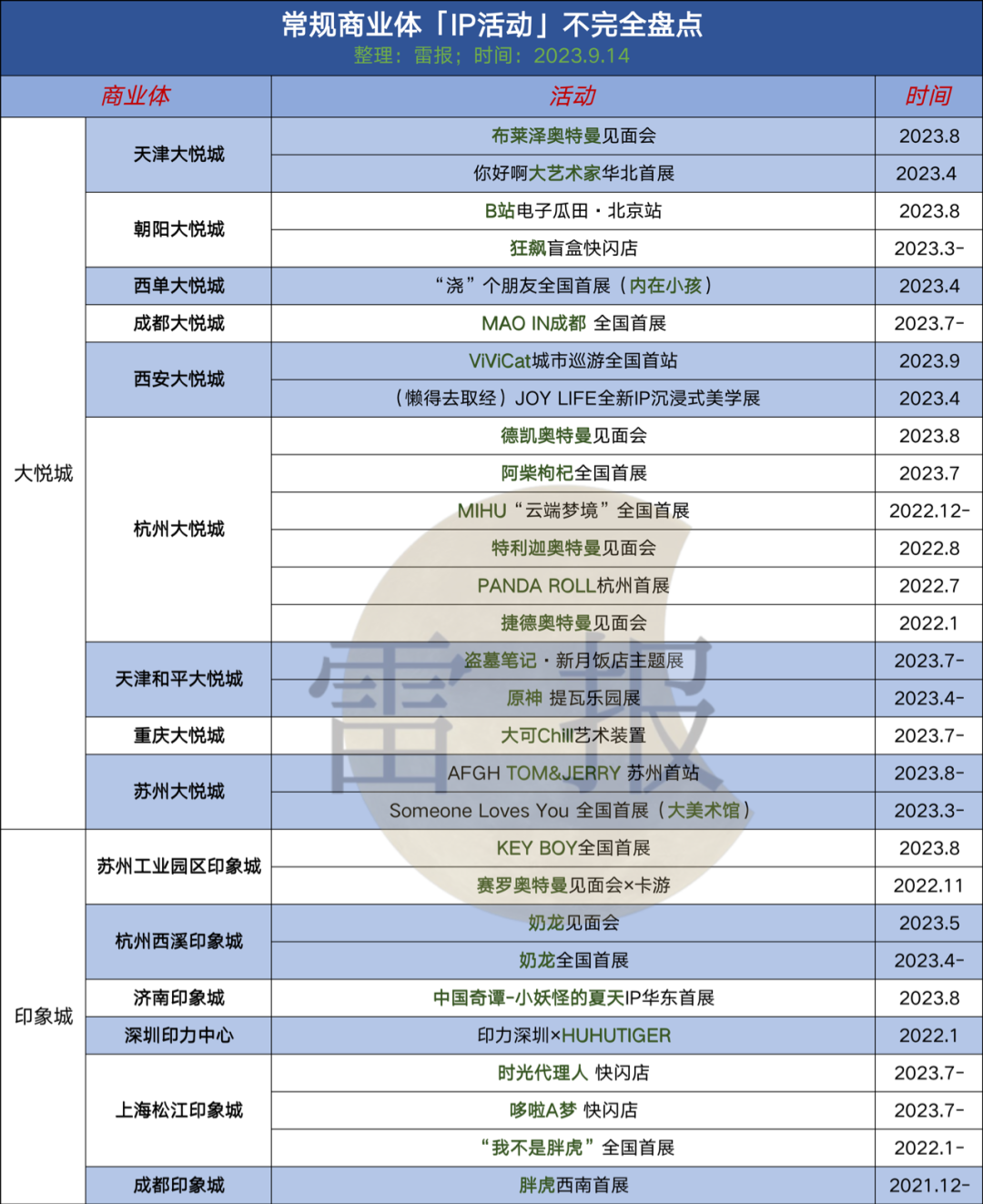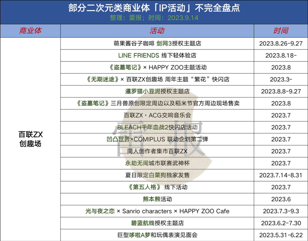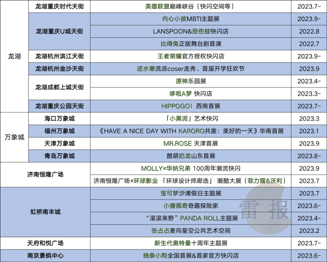從IP+商業(yè)體出發(fā),我們對部分商業(yè)體內(nèi)(常規(guī)性及二次元屬性顯著的商業(yè)體)的IP活動進行了不完全統(tǒng)計。