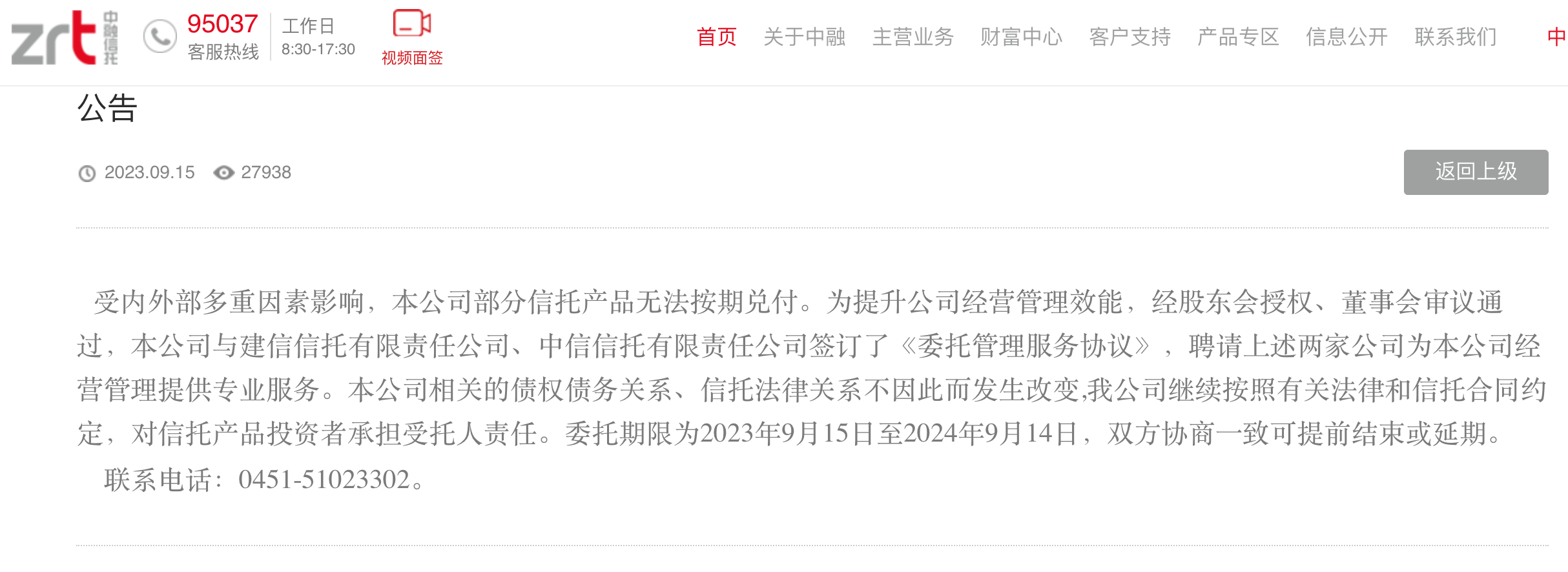 再觀中融信托方面,在9月15日其官網(wǎng)也有發(fā)聲。中融信托稱,“受內(nèi)外部多重因素影響,本公司部分信托產(chǎn)品無法按期兌付。為提升公司經(jīng)營管理效能,經(jīng)股東會授權(quán)、董事會審議通過,本公司與建信信托有限責(zé)任公司、中信信托有限責(zé)任公司簽訂了《委托管理服務(wù)協(xié)議》,聘請上述兩家公司為本公司經(jīng)營管理提供專業(yè)服務(wù)。本公司相關(guān)的債權(quán)債務(wù)關(guān)系、信托法律關(guān)系不因此而發(fā)生改變,我公司繼續(xù)按照有關(guān)法律和信托合同約定,對信托產(chǎn)品投資者承擔(dān)受托人責(zé)任。委托期限為2023年9月15日至2024年9月14日,雙方協(xié)商一致可提前結(jié)束或延期?!?/span>
