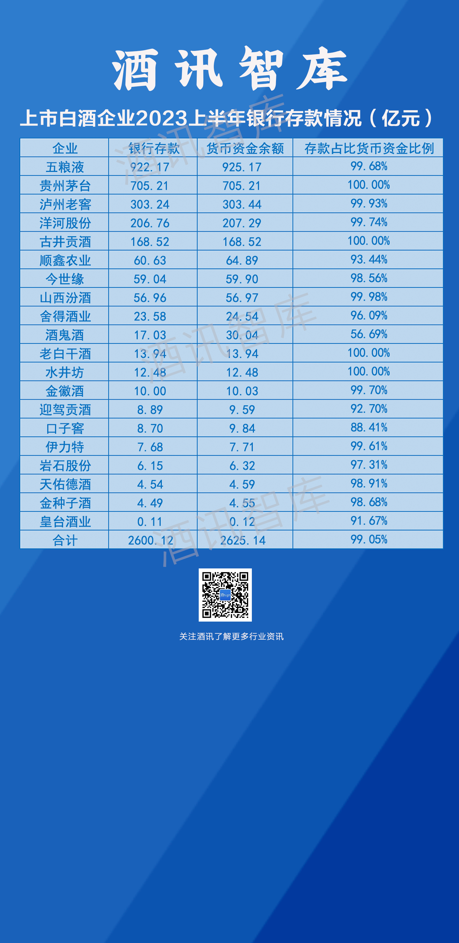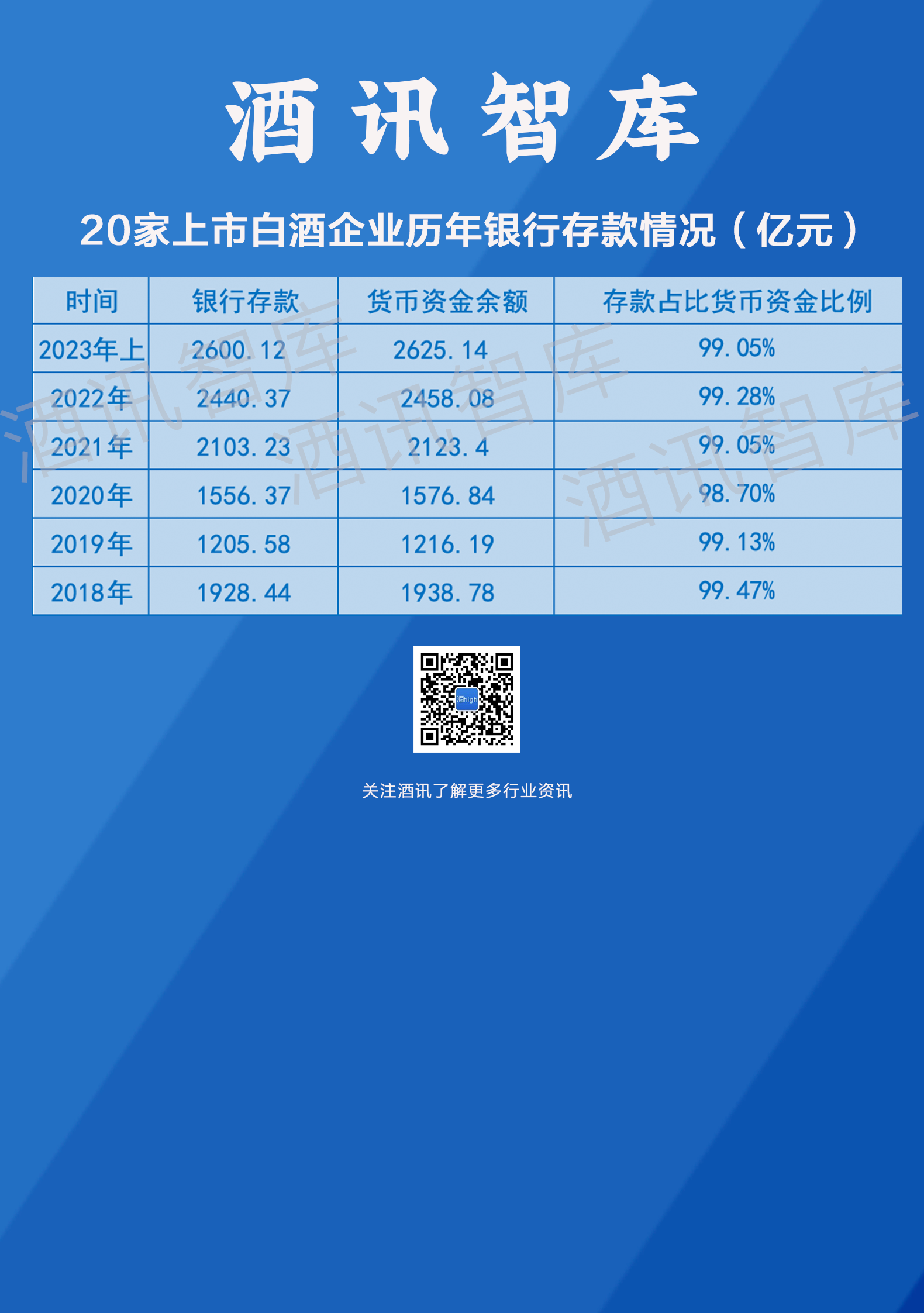 酒訊智庫統(tǒng)計(jì)了解到,2023上半年,20家上市白酒企業(yè)的“銀行存款”累計(jì)金額為2600.12 億元,占比上半年貨幣資金余額的比例為99.05%。也就是說,白酒企業(yè)們將幾乎所有的貨幣資金都存到了銀行里。