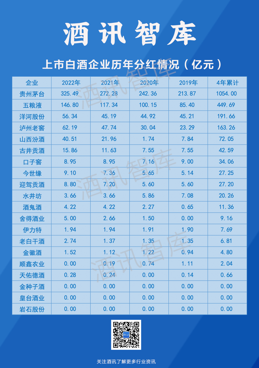 整體來看,2019-2022年期間,除金種子酒、皇臺酒業(yè)、巖石股份三家上市白酒企業(yè)外,其余17家均進(jìn)行過金額不等的分紅(順鑫農(nóng)業(yè)2022年未進(jìn)行分紅),4年累計(jì)分紅金額在0.66-1054.00億元之間。