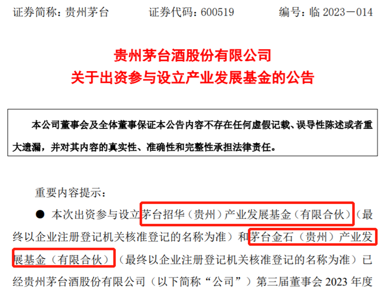 2023年5月,貴州茅臺發(fā)布公告稱公司擬將出資設(shè)立兩只產(chǎn)業(yè)基金,即以有限合伙的形式與招商局資本投資有限責(zé)任公司、金石投資有限公司合伙成立兩只產(chǎn)業(yè)發(fā)展基金,每只基金首期出資20億元。這也是貴州茅臺首次設(shè)立產(chǎn)業(yè)基金。