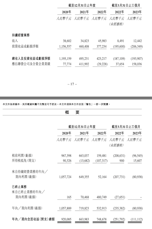 2023年第一季度,天圖投資持續(xù)經(jīng)營業(yè)務收入約為1244.2萬元;總收入及投資錄得1.94億元虧損;持續(xù)經(jīng)營業(yè)務錄得8093.8萬元虧損。