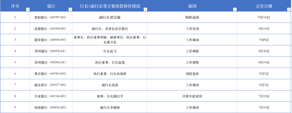 具體看辭任情況,近兩個(gè)月上市銀行中包括5家行長(zhǎng)、4家副行長(zhǎng)辭任;辭任原因方面,貴陽(yáng)銀行、重慶銀行、興業(yè)銀行3家副行長(zhǎng)/行長(zhǎng)均為“到齡退休”,其余6家為“工作變動(dòng)/工作調(diào)整”。
