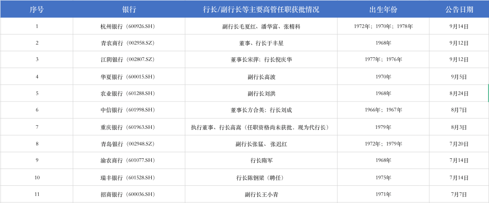 今年7月份以來(lái)A股上市銀行行長(zhǎng)/副行長(zhǎng)等主要高管任職獲批情況。資料來(lái)源:公告,時(shí)代財(cái)經(jīng)/制表。