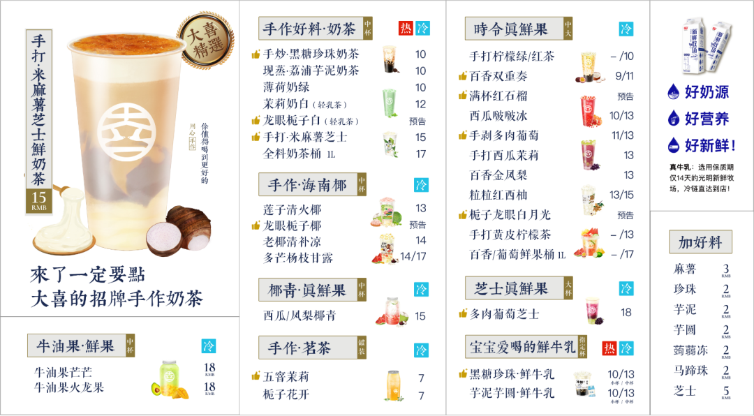 比如上文提到的大喜手作轉(zhuǎn)型升級后,“在吧臺肉眼可見的切水果、煮小料,消費(fèi)者會認(rèn)為我們做東西用心、健康、真材實料?!碧镥\涵表示。