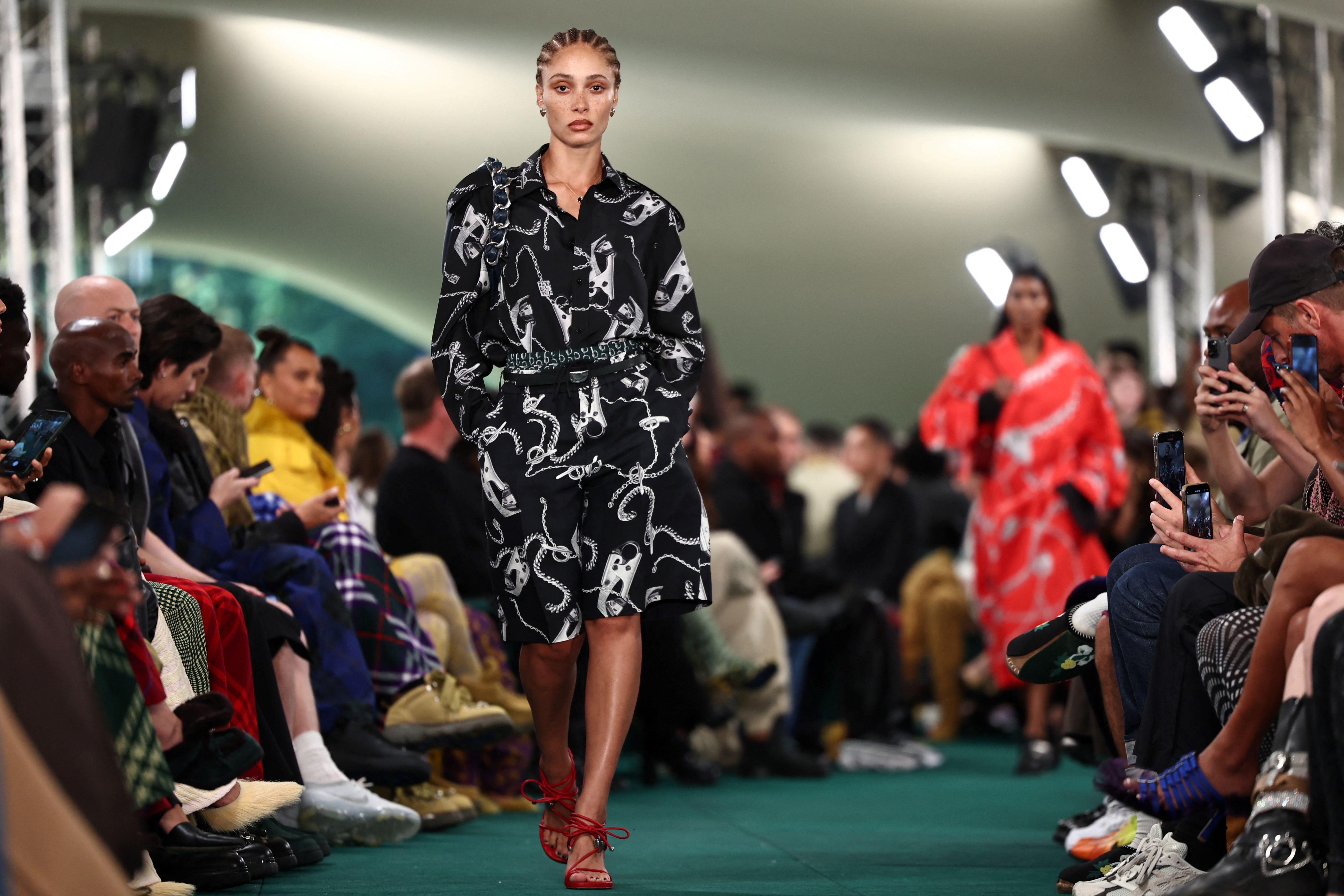 雖然少了張揚的視覺效果,但這場秀也沒有走向完全的經(jīng)典和保守。以傳統(tǒng)英倫風格元素為例,除了風衣之外,格紋圖案和此前在廣告中被大量運用的藍色并沒有得到顯著延續(xù)。取而代之的是印在襯衫和裙裝上的鎖鏈圖案,靈感來自于Burberry包袋上的金屬裝飾。