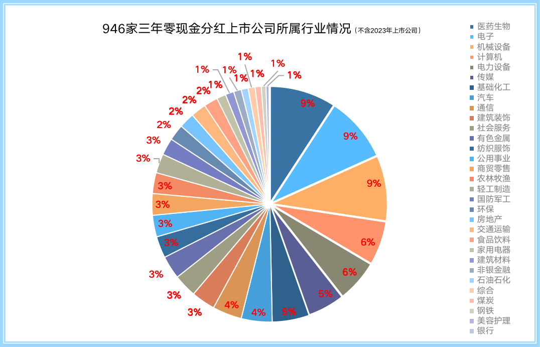 界面新聞記者據(jù)同花順iFind數(shù)據(jù)統(tǒng)計,A股市場有1203家公司過去三年(以2020年至2022年年報披露分紅數(shù)據(jù)為準)未分紅,剔除2023年上市的257家公司,仍有946家公司過去三年對股民“一毛不拔”。946家公司中不乏鹽湖股份(000792.SZ)等實現(xiàn)百億級盈利卻連續(xù)三年未分紅的公司。從行業(yè)來看,醫(yī)藥生物業(yè)、電子行業(yè)、機械設(shè)備業(yè)以及計算機業(yè)“鐵公雞”最多。