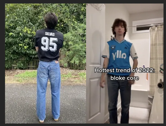 2021 年底,蘭登·亨特利 (Brandon Huntley) 在圣誕節(jié)收到了一件球衣。他住在美國,23 歲,每天玩 TikTok,而且很熱愛英式足球。收到球衣,穿上喇叭牛仔褲打扮一番后,他覺得自己像是個(gè) 50 歲的英國「街頭小混混」,有點(diǎn)好笑但又覺得很喜歡……于是就在浴室門口拍了視頻,開玩笑說這就叫 Blokecore 時(shí)尚。