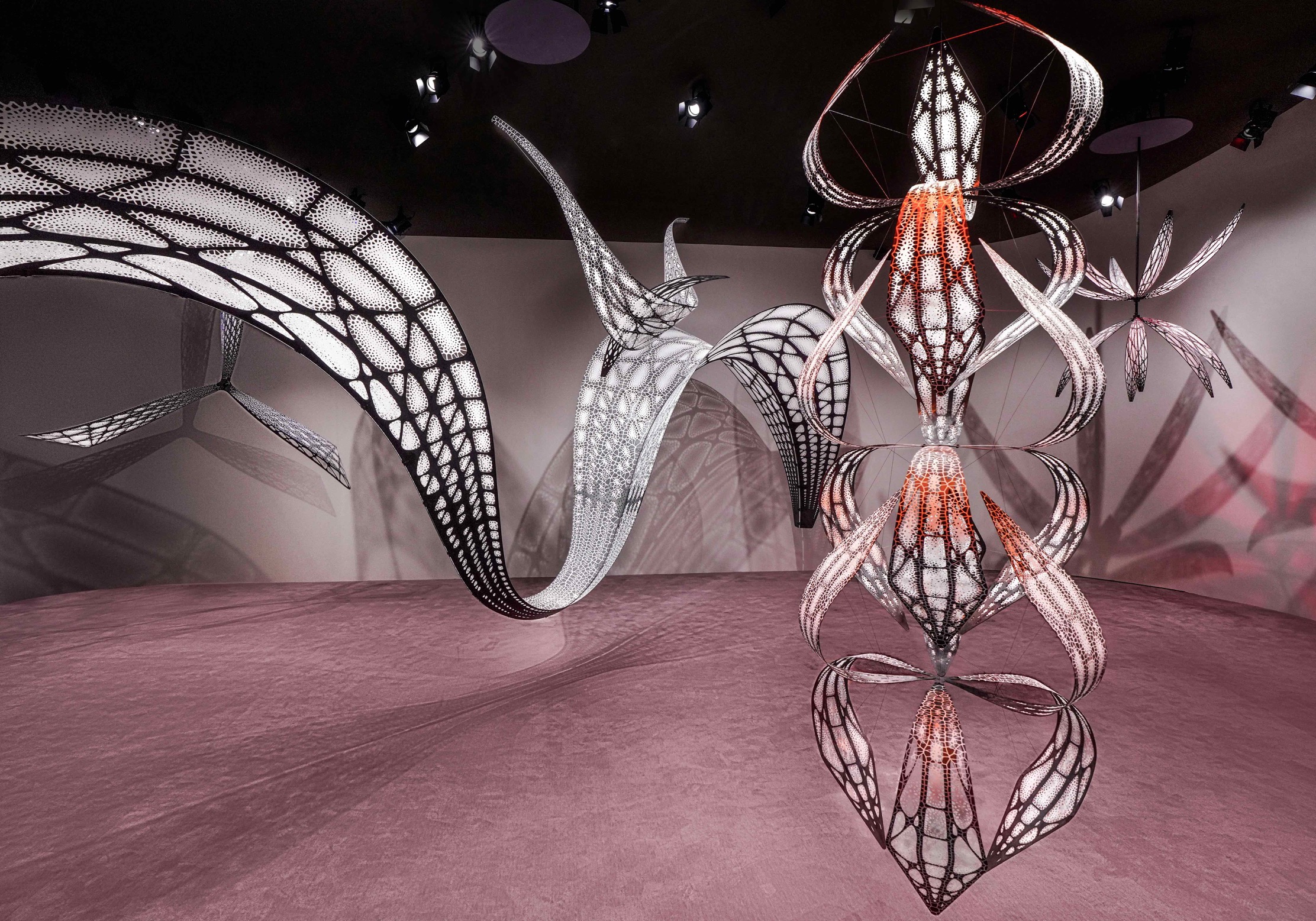 這場表演由法國奢侈品牌愛馬仕Hermès組織,作為其2023高級鐘表展的一環(huán)。在當(dāng)天位于淮海路的“愛馬仕之家”內(nèi),有另一場同樣借助不同介質(zhì)進(jìn)行的藝術(shù)表達(dá):法國年輕藝術(shù)家Clément Vieille用碳纖維和紙雕打造了多個(gè)網(wǎng)狀雕塑,其在機(jī)械裝置的推動下于展覽空間內(nèi)或收縮,或旋轉(zhuǎn),或擺動。