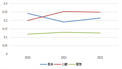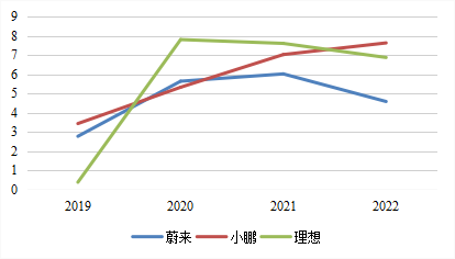 在這個(gè)指標(biāo)上,理想連續(xù)三年始終十分穩(wěn)健,而且在三家企業(yè)中處在最低水平。更讓人驚訝的是,理想2019年的銷管費(fèi)用率還處于242.43%的超高位,但2020年卻迅速降至最低水平,約為11.83%。一般的推斷是,這主要得益于2020年理想ONE的上市,給理想的營(yíng)收帶來巨大突破,但蔚來和小鵬在有新車上市的2019年,其銷管費(fèi)用率也依然高達(dá)50%左右。除了營(yíng)收開源,理想在降本增效上,確實(shí)有點(diǎn)東西。