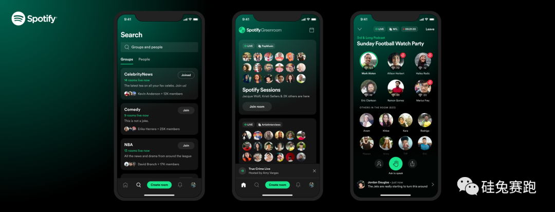 Spotify也在同月推出了自家的Clubhouse競品 - Greenroom,是基于此前收購的體育音頻內(nèi)容app Locker Room而成,來自全球的用戶都可以創(chuàng)建和參與語音聊天室,還可以將對話生成為播客。
